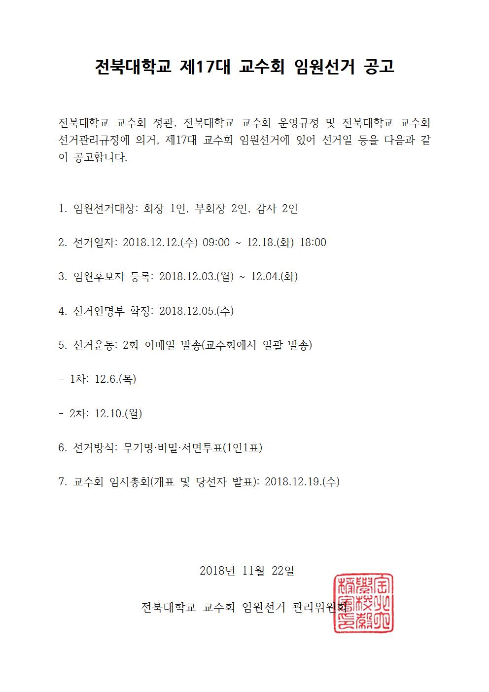 전북대학교 제17대 교수회 임원선거 공고